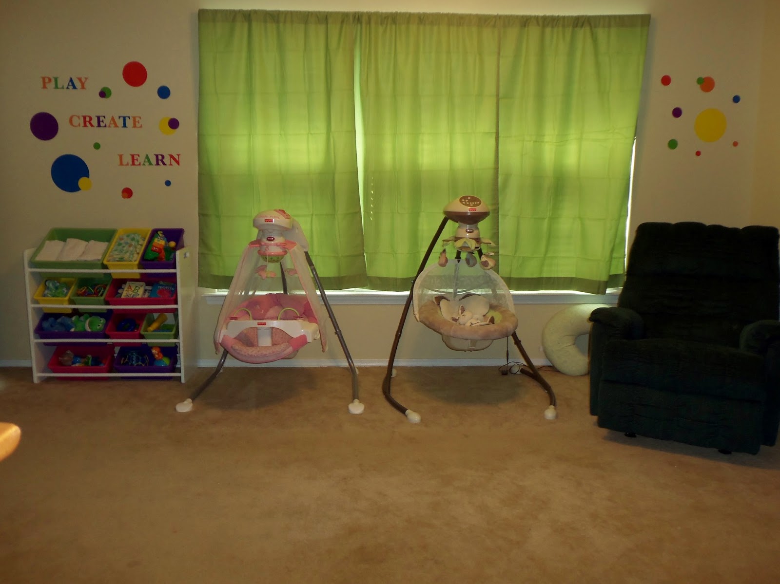 Alongside the largest wall is the play area, swings, and recliner. Once again, as the babies age out of the swings we will place exersaucers, walking toys, etc. against the wall. The large windows allow for a tremendous amount of sunlight to shine through, so we bought energy-efficient black out curtains. (The curtains were open in the other pictures, making the room appear much brighter. This picture obviously makes the room look darker since the curtains are closed.)
