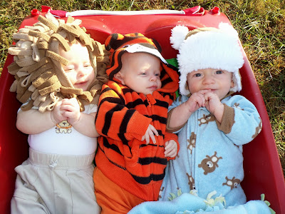 We were invited to attend a fall festival/trunk or treat event by my sister-in-law. This meant I needed to figure out the babies' Halloween costumes ASAP! We have so many solid pink onesies, I originally had the three little pigs in mind. Then I realized how cold it would be and how hard it was to find affordable baby pig hats. I had no clue how expensive Halloween costumes cost! I set my budget for $30 and after a lot of digging and borrowing, I was able to create a lion, tiger, and bear outfit.