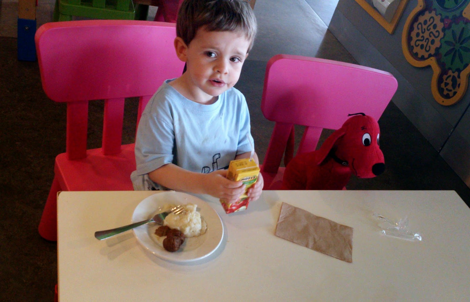 Jackson ate the same. I love IKEA food because it is cheap ($2.99 per kid's plate), tasty, and there is a variety of organic and vegetarian options. Jackson ate in the kid's area while I set up highchairs at a table across from him.